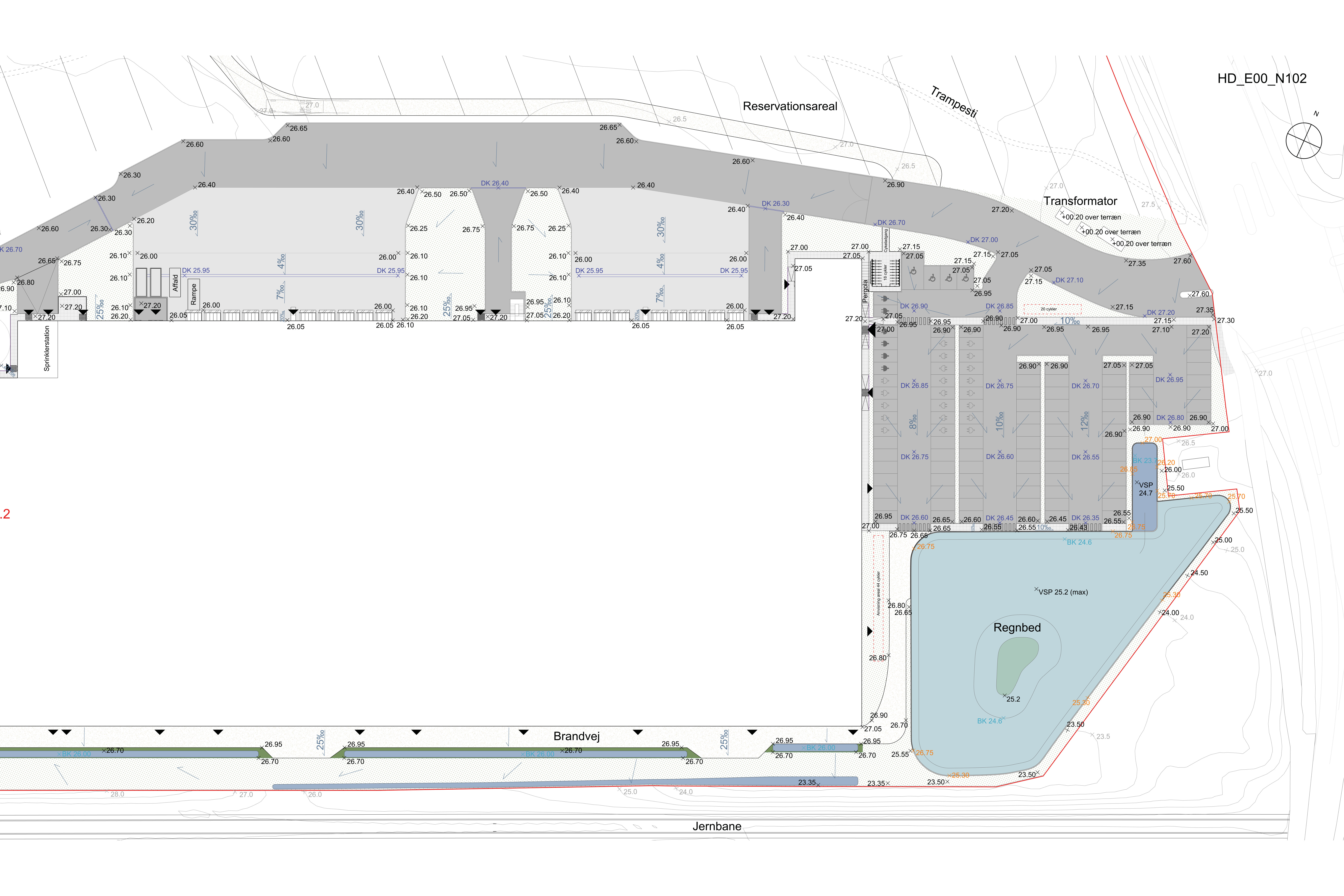 Herunder terrænbearbejdning/kotering med fokus på tilgængelighed, jord- og vandhåndtering, parkering samt opholdsareal.
